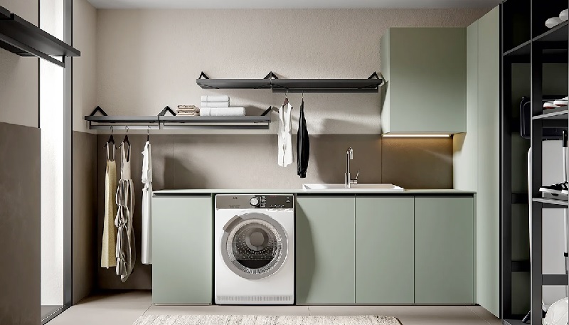 Per un approccio moderno e minimalista, si potrebbe optare per un design con linee pulite e materiali contemporanei come il metallo o il vetro. Questi materiali non solo aggiungono un tocco di eleganza e modernità allo spazio, ma sono anche facili da pulire e mantenere, ideali per un ambiente di lavanderia che richiede praticità oltre che estetica.